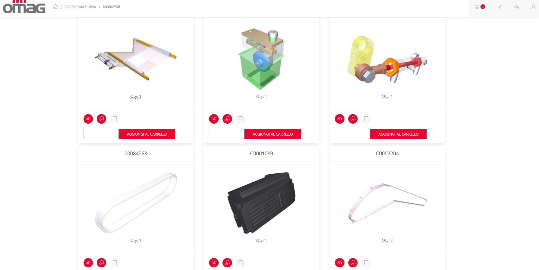 Another benefit is related to the possibility of explore the 3D of the machine or to ask for a offer for spare parts directly from the portal. This solution make easier the customer request, above all for internal components of the machine, without the risk of a classic e-commerce. The request of spare parts, in fact, will be taken in charge from the Omag After Sales Team, that will generate an appropriate offer for the required items.